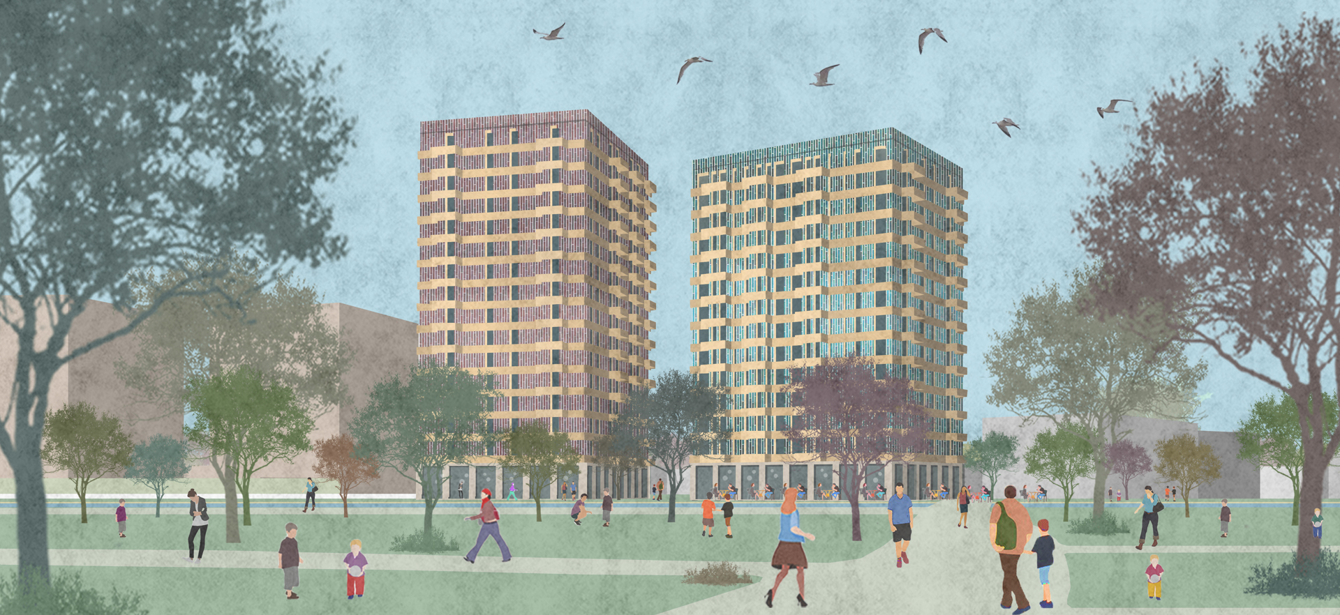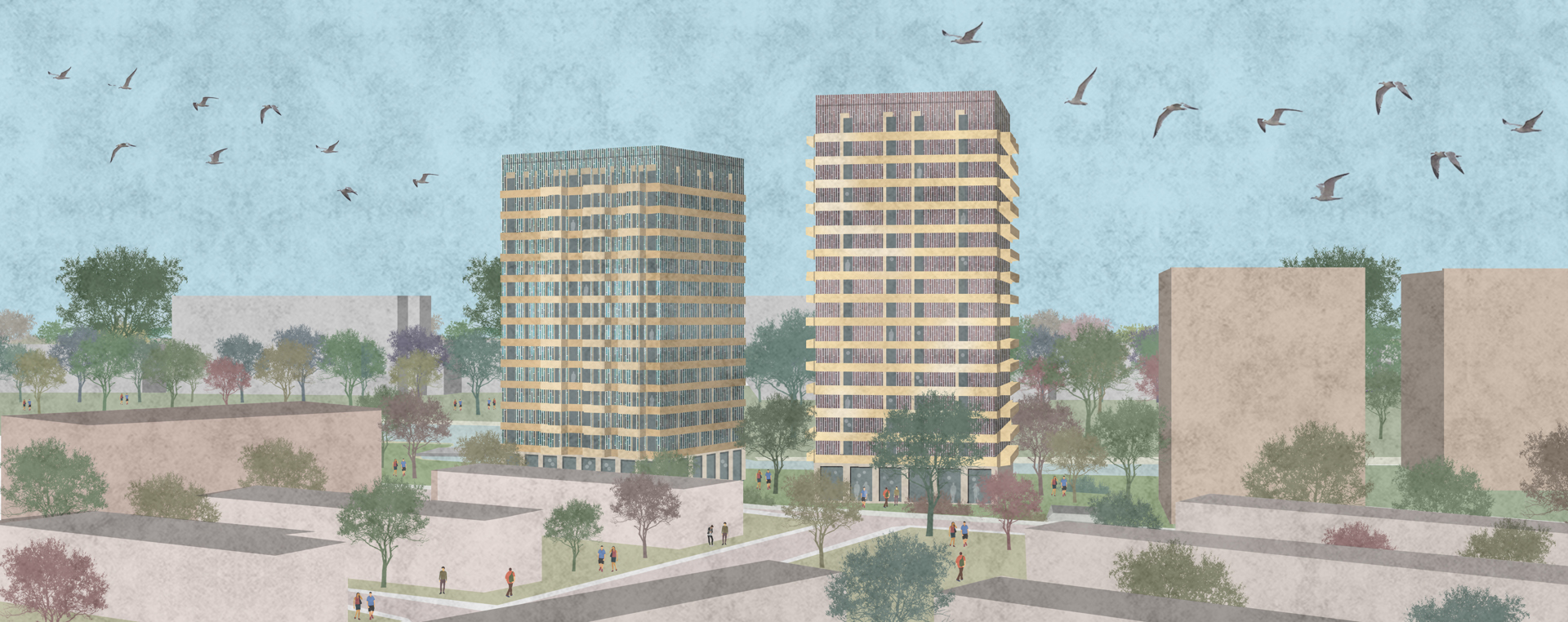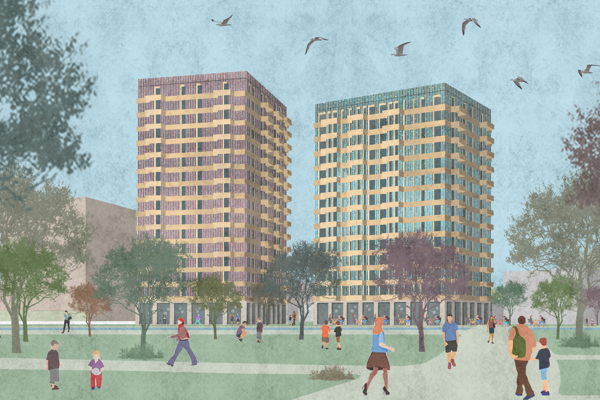 De nieuwbouw bestaat uit twee woontorens van 14 en 16 verdiepingen hoog, dat is hoger dan de 8 en 10 verdiepingen nu. De woontorens liggen in een groene omgeving tussen woonbuurten en Centrum. De maximale hoogte van de torens is bekend: de noordelijke toren wordt 16 lagen (ca. 50 meter), de zuidelijke toren wordt 14 lagen (ca. 45 meter). Hoe de gebouwen eruit komen te zien, is nu nog niet bekend. Wel vinden we het belangrijk dat de woontorens een aantrekkelijk markeringspunt vormen van de entree naar het park. Mooie nieuwbouw is een verbetering voor deze unieke plek aan de rand het park.